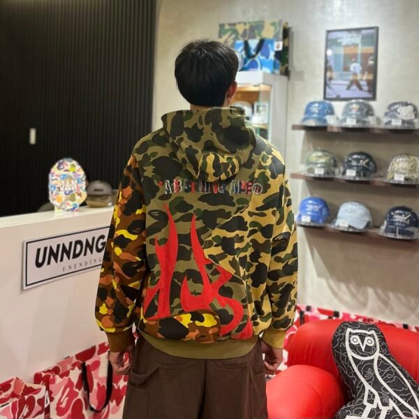 BRANDNEW BAPE 1st Camo Upcycled Patchwork Flame Relaxed Fit Zip Up Hoodie (Large)