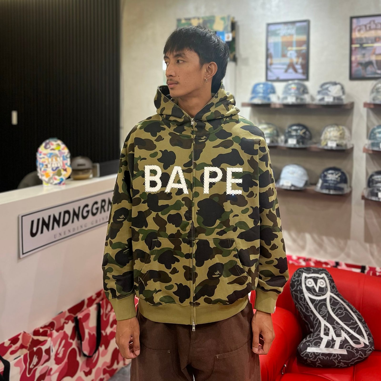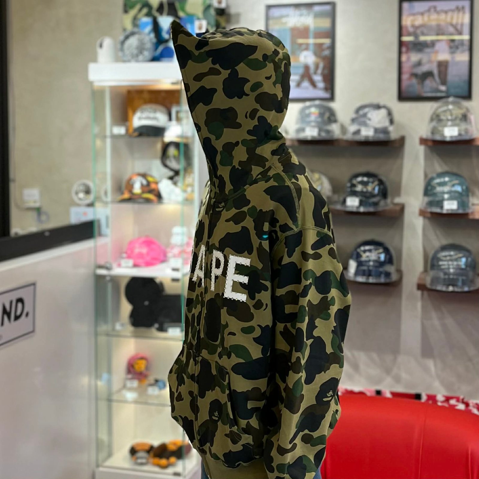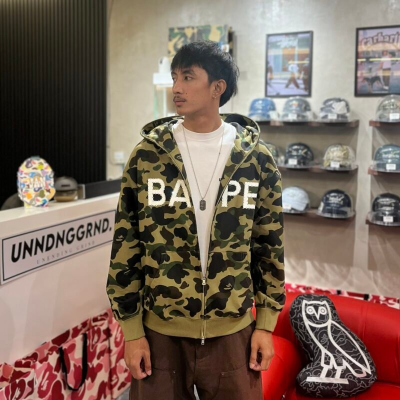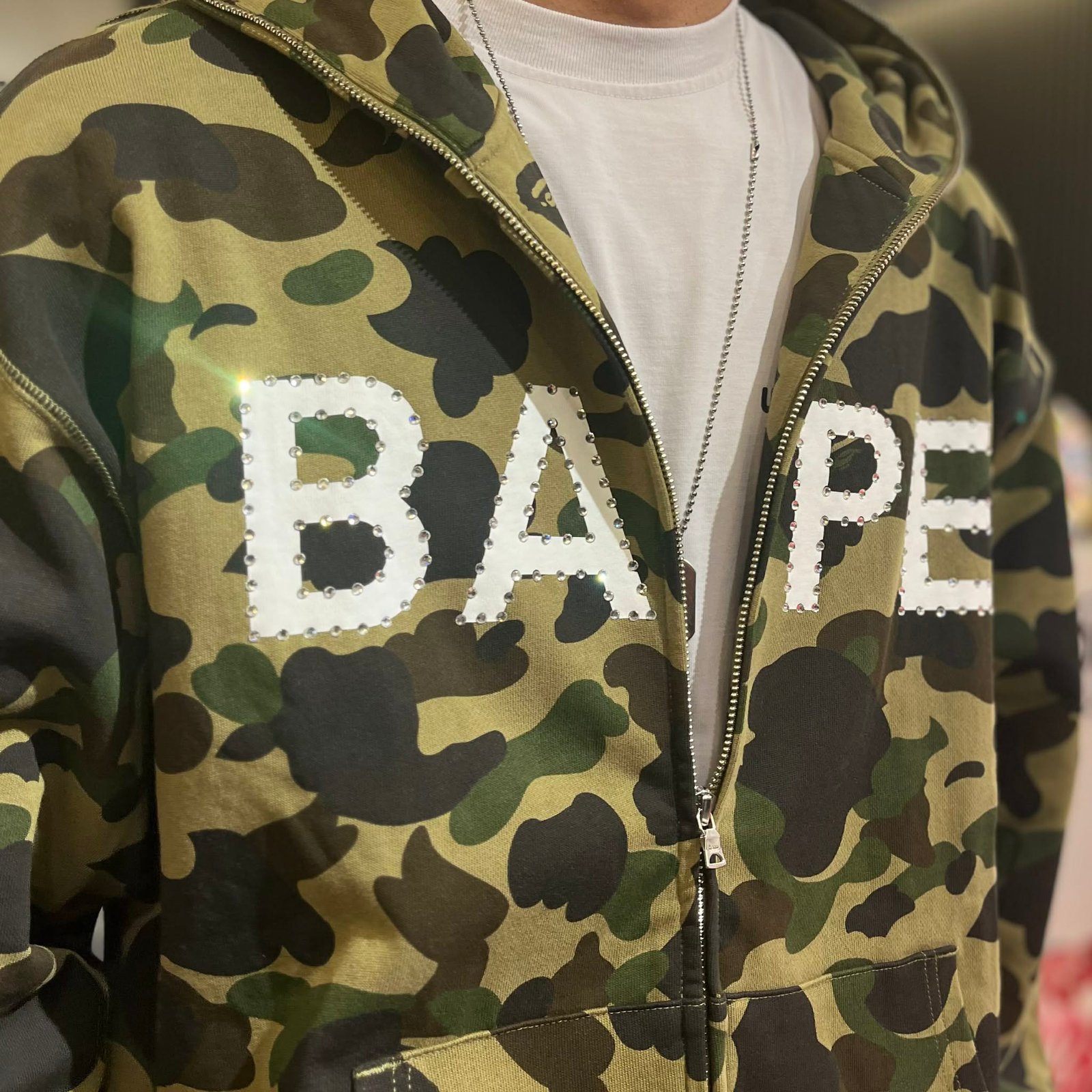 BRANDNEW BAPE 1st Camo Rhinestone Logo Green Full Zip Hoodie (Large)